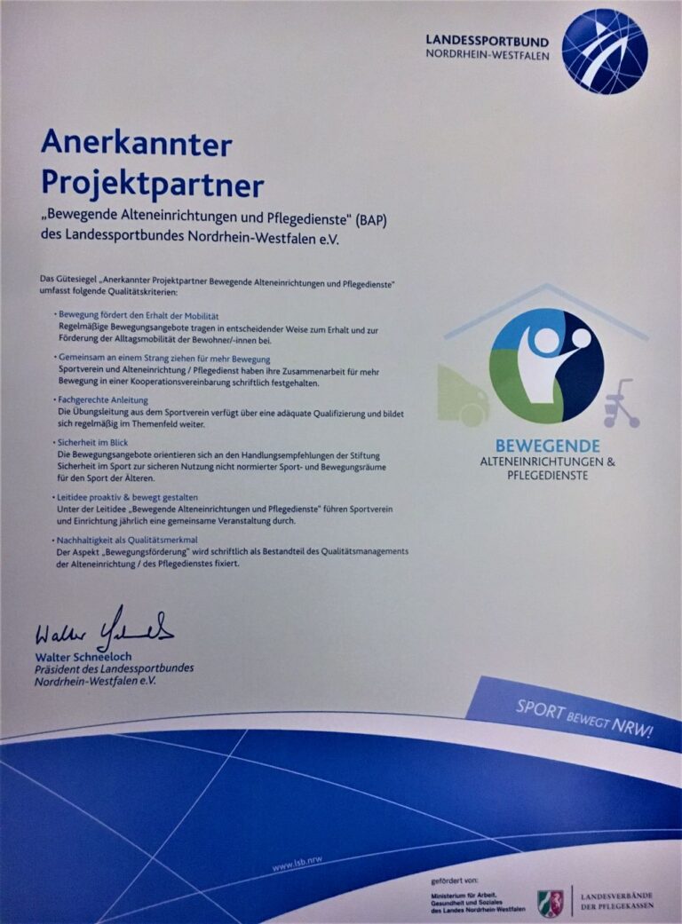 Die Beantragung und Prüfung der Unterlagen zur Aufnahme in das BAP-Förderprogramm des LSB fanden ihren Abschluss in dem Bewiligungsbescheid, aufgrund dessen der Verein seit dem 2.1.2018 als Kooperationspartner des Luchtenberg-Richartz-Hauses in deren Räumen ein Sportangebot unterbreiten kann. Wir danken Frau Hoferichter in ihrer Funktion als Heimleitung und Frau Glaubitz, der Leiterin der Tagespflege, für die Bereitschft, auf dieses Experiment einzugehen. Sie sind vor dem teilweise recht aufwändigen Schriftverkehr nicht zurückgeschreckt und können ihrem Qualitätshandbuch zum Thema Expertenstandard „Mobilisation“ einen weitern Baustein hinzufügen. Dass diese Gruppe zustande kommen konnte und weiterhin besteht, spiegelt wider, dass sowohl im Luchtenberg-Richartz-Haus als auch im RBS qualitativ hochwertige Arbeit geleistet wird. Die Krone für all diese Bemühungen durften das Heim und der Verein in Form des LSB-Gütesiegels in Empfang nehmen.